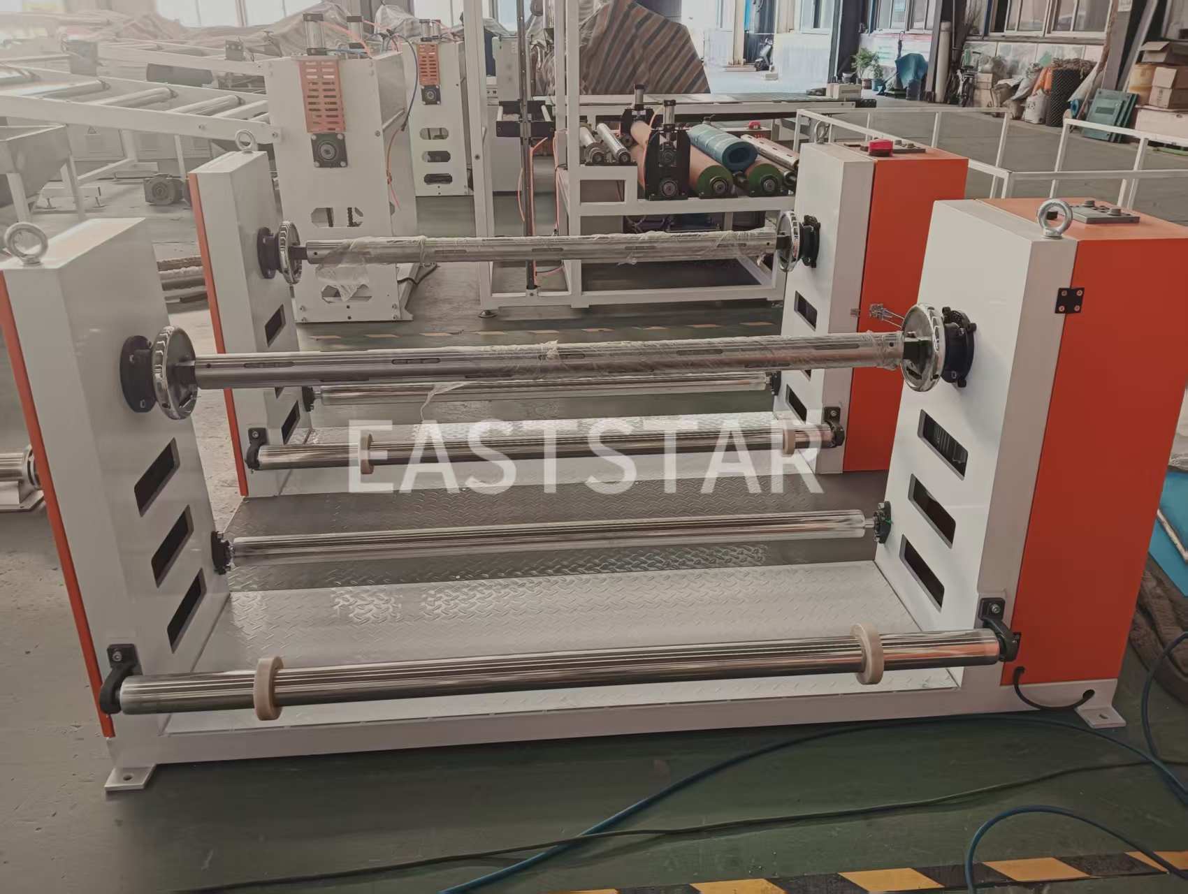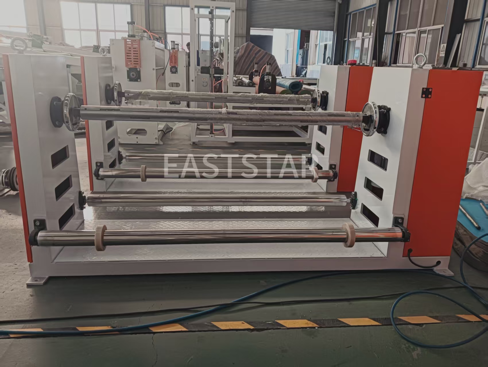ローラー温度制御システムは軟化した清水を媒体として使用し、温度制御精度は±1℃で、2.2KWの温水ポンプと3組の9KWヒーターを備えています。デュアルステーション巻き戻し装置には空気圧シャフトと張力制御システムが装備されており、連続生産を実現します。の防水膜生産ラインエッジトリミング装置と廃棄エッジ巻き取りシステムも装備されており、製品のエッジをきれいに保ちます。