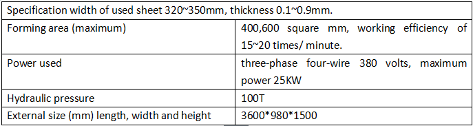 苗床トレイ播種製造機の技術パラメータ 仕様使用シート幅:300~320mm、厚さ:0.8~2mm。 成形エリア(最大):400*600mm、作業効率15~20回/分。 使用電力:三相4線380ボルト、最大電力25KW 油圧:100T 外形寸法(mm)長さ、幅、高さ)3600mm*980mm*1500mm