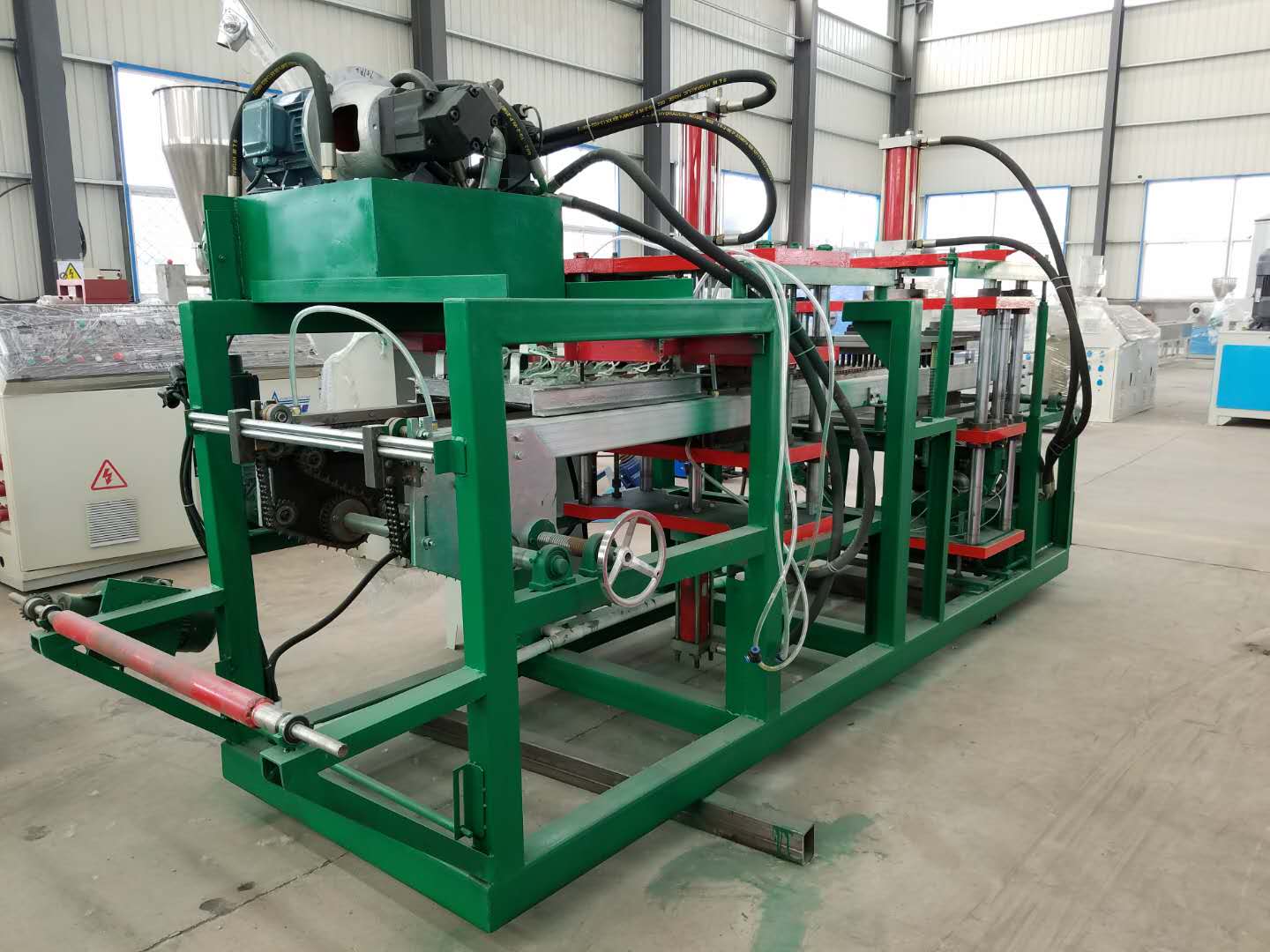 苗箱プラグトレイ装置の技術パラメータ 仕様使用シート幅:300~320mm、厚さ:0.8~2mm。 成形エリア(最大):400*600mm、作業効率15~20回/分。 使用電力:三相4線380ボルト、最大電力25KW 油圧:100T 外形寸法(mm)長さ、幅、高さ)3600mm*980mm*1500mm